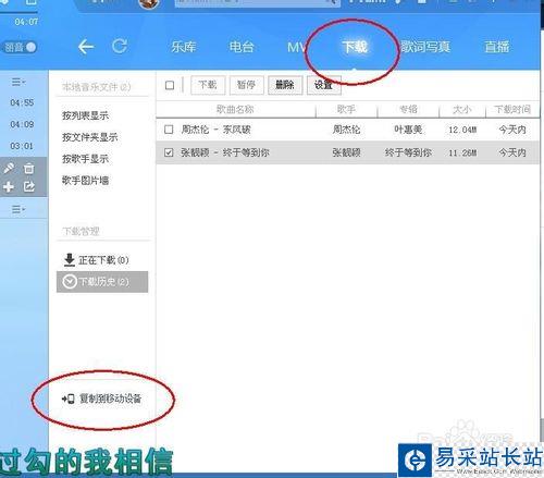 5、或者您可以先將批量的歌曲下載到自己的電腦中,之后在酷狗播放器的“下載”頁面中下載成功的歌曲里選擇,勾上自己需要批量下載到手機的歌曲,點擊“復制到移動設備中”。