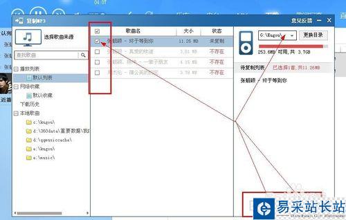 6、彈出復制到移動設備的對話框,您只要對其需要下載的歌曲前面打鉤,在勾選好的歌曲下方點擊“開始復制”即可復制,如果您需要下載歌詞別忘了在“復制歌詞”前打勾哦