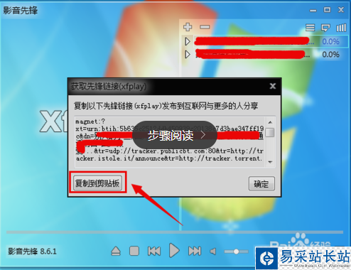 從彈出的”獲取xfplay磁鏈“窗口中點(diǎn)擊”復(fù)制到剪貼板“按鈕,以便復(fù)制磁鏈至剪貼板。