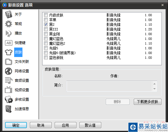 4、皮膚設置:影音先鋒內嵌了十幾款播放器界面皮膚,如玻璃界面、黑金剛、魔幻藍色等