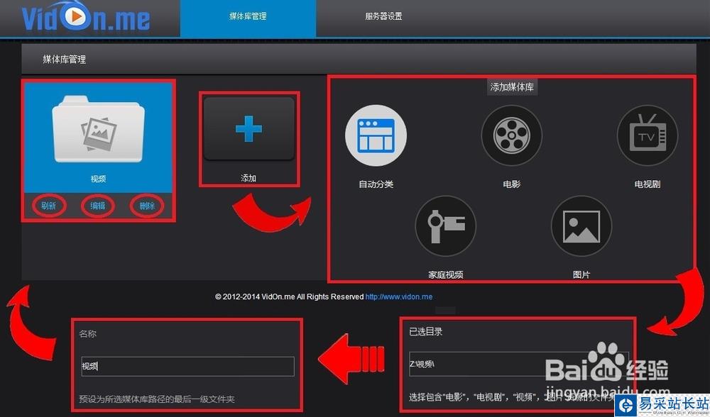 (1)在PC端安裝威動服務器(VidOn Server),在服務器的圖標(電腦右下角)單擊右鍵并且選擇“服務器管理”,在瀏覽器中彈出威動服務器頁面,點擊“+”,選擇要添加的媒體庫類型,推薦選擇“自動”。