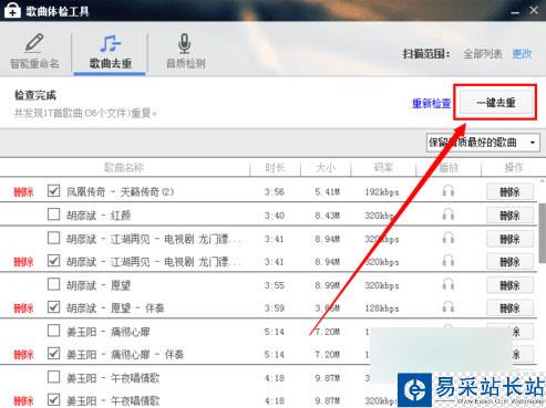 當然可以通過點擊“一鍵去重”將對所有的重復歌曲進行快速的刪除,這樣更方便,不過就不能保證最優了。