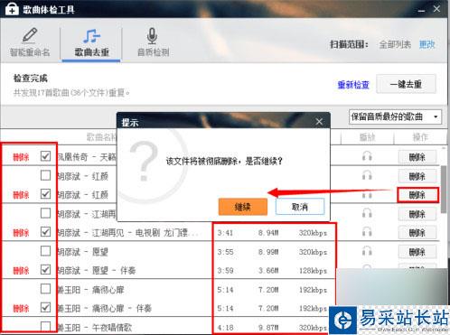 很快,在下方就會出現重復的音樂文件的信息,我們可以逐一的進行篩選刪除,保留自己喜歡的版本。
