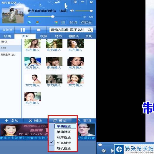 第三步:分別雙擊選中的歌曲和和照片,并設置歌曲播放模式和圖片播放模式,分別在“歌曲”和“圖片”功能模塊下,單擊“模式”功能,進行相應的設置,如下圖: