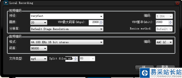 到這里已經基本設置OK了,如果你想錄視頻的話點擊【廣播】【錄制視頻】,第一次會彈出錄制視頻的品質設置,按照下圖的設置,上傳到優酷的視頻就已經是超清的了。電腦硬件不是很好的,可以適當調低畫質,和最大碼率。