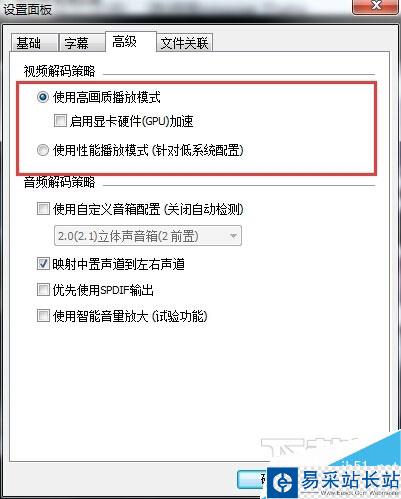 3、進入設置的畫面,選擇“高級”,在視頻解碼策略中,把“啟用顯卡硬件(GPU)加速”的勾去掉,最后,點擊“確定”就可以了。