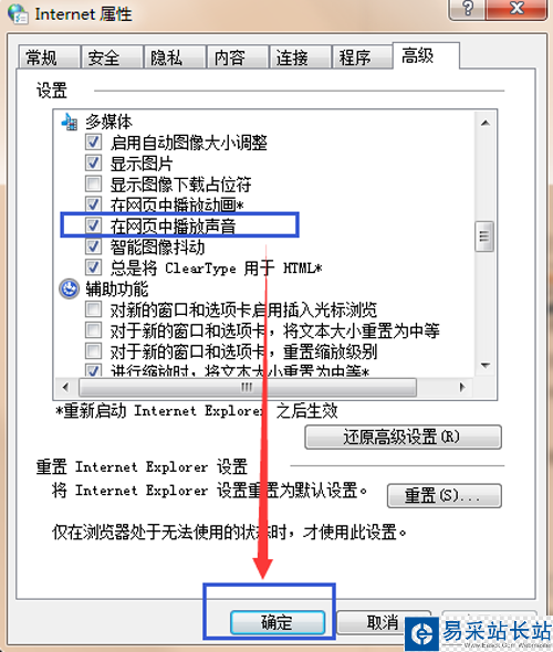 2、查看 Internet 選項(xiàng) -> 高級(jí) -> 多媒體 -> 播放網(wǎng)頁中的聲音是否勾選,如下圖所示: