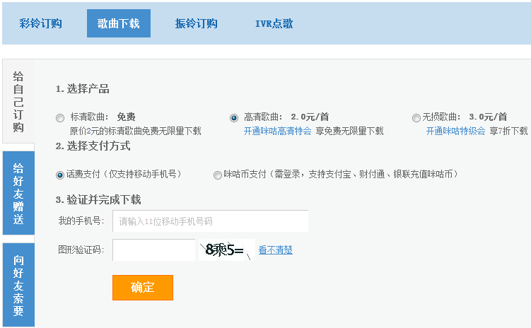 2.在訂購頁面中輸入手機號、圖形驗證碼。獲取短信驗證碼并輸入,點擊確定,完成彩鈴訂購。