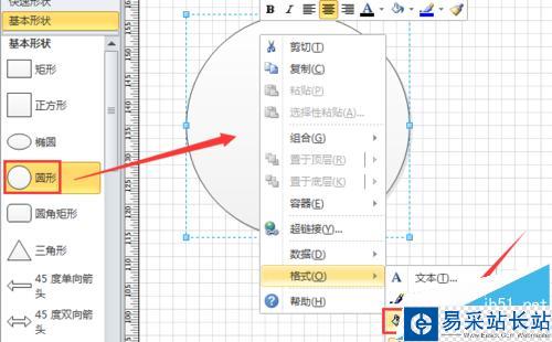2、接著,從左側拖入一個“圓形”,單擊鼠標右鍵,選擇“格式”-“填充”選項,將其填充顏色設置為“銀灰色”,如圖所示。