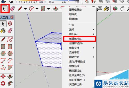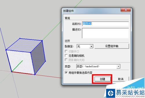 4、選中正方體,單機(jī)右鍵選中“創(chuàng)建組件”,點(diǎn)擊“創(chuàng)建”選項(xiàng)。