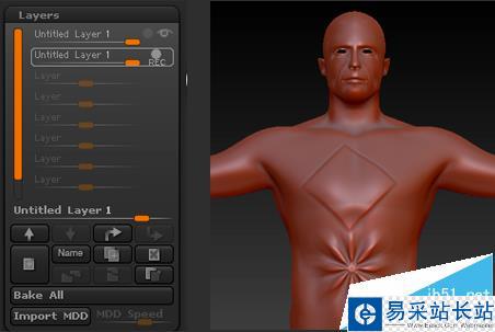 2、單擊Tool>Layers(工具>繪制層)面板中單擊New(新建)按鈕,創(chuàng)建一個(gè)新層,選擇合適的筆刷和Alpha,在模型上拖拽鼠標(biāo)左鍵,得到一個(gè)方形紋理,如下圖所示。