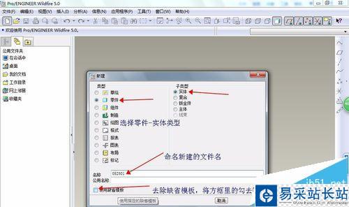3、選擇零件-實(shí)體,為新建的文件命名,接下來(lái)去除缺省模版,之后點(diǎn)擊確定;