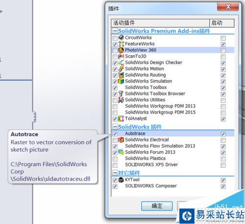 3、彈出加載選項設(shè)置框。以AUTOTRACE插件的加載為例。找到AUTOTRACE所在的行,將這一行左側(cè)(表示當(dāng)前需要加載)和右側(cè)(表示啟動時需要默認加載)的選框分別打上勾。點擊確定。