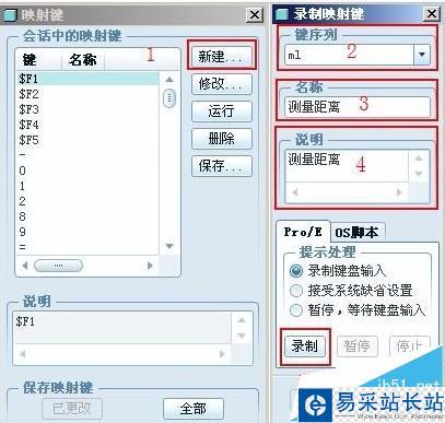 2、在映射鍵對話框中點選標號1處“新建”->標號2處輸入“鍵序列”(就是鍵盤的快捷鍵)->標號3和4處輸入名稱和說明->點選5處“錄制”。
