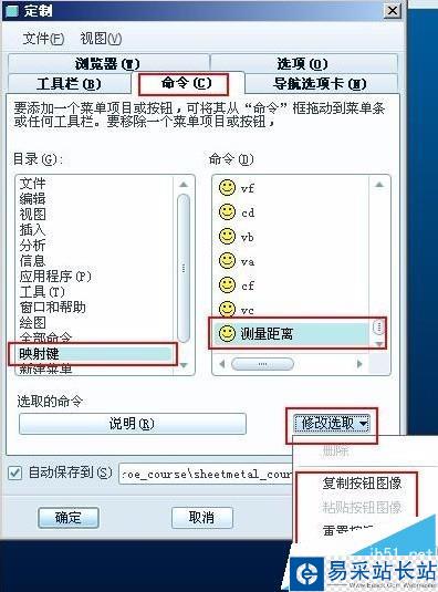 8、可以通過“工具”菜單->選擇“定制屏幕”來設置剛才創建的映射鍵圖標,如下圖。可以為此映射鍵“選擇按鈕圖像”或“編輯按鈕圖像”進行自定義圖標,Pro/ENGINEER提供很多按鈕圖標,圖中只是其中的一部分。完成了圖標的設置您可以把該圖標拖動到工具條中。