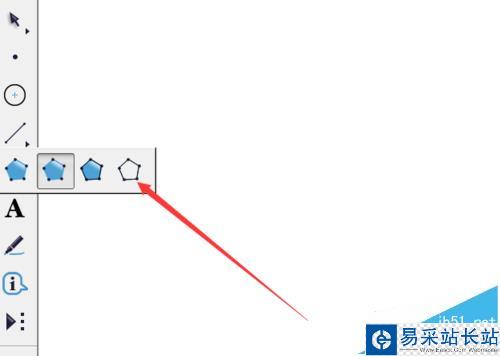 1、啟動幾何畫板5.06以后,可以看到面板上有個多邊形工具,單擊這個工具旁的小三角形按鈕,可以選擇多邊形類型。