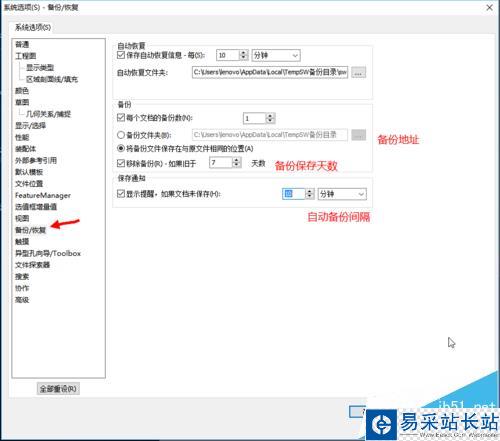 2、選擇備份/恢復選項。查找到自動保存地址,這里最好設置一下,地址選擇與文件夾相同位置, 如果你沒有時時保保存文件的習慣,建議你選擇10分鐘保存提醒。