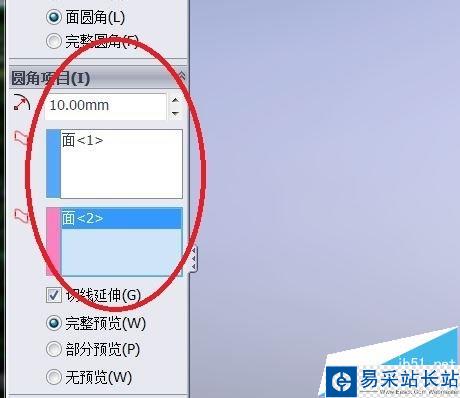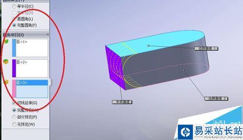12、完整圓角 繪制圓角。這種方法不需要設置半徑,需要順序選中三個面,側面1、中間面、側面2。可以看到設置完成后的預覽