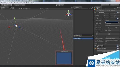 4、軟件打開后的界面,在層窗口中只有一個攝像機,單擊攝像機,在場景窗口會顯示一個小窗口顯示攝像機在游戲中的視圖。