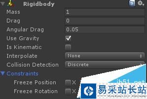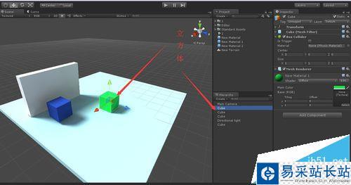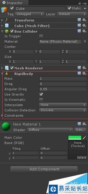 5、這時(shí)所選擇的立方體就有了剛體組件。添加了這個(gè)組件的游戲?qū)ο罂梢越邮芡饬团ぞ亓Γ⑶蚁裾鎸?shí)的物體一樣接受摩擦力和重力,還可以與其他物體發(fā)生相互碰撞。