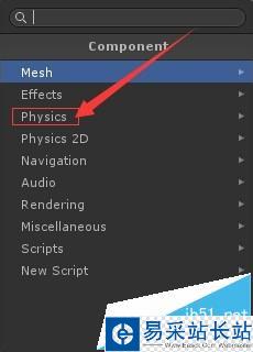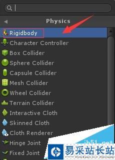 4、在彈出的窗口中,單擊physics;彈出新的窗口,單擊rigidbody(剛體)。