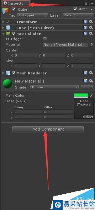 3、然后再檢視窗口,為選擇的立方體添加一個(gè)組件,單擊add componet。