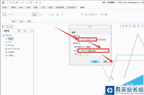 5、選擇“TOP平面”作為草繪平面。“RIGHT”作為基準平面