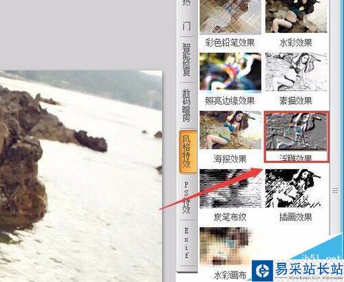 6、點擊風格特效命令,進入風格特效的編輯工具區,在這個編輯區里找到浮雕效果選項,如圖所示: