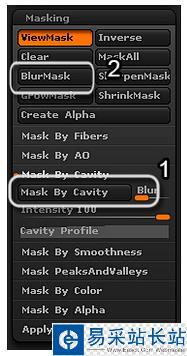 5、接下來,進入Masking子菜單,激活Mask By Cavity選項,將遮罩所有的空洞,然后按Blur Mask按鈕模糊遮罩邊緣。