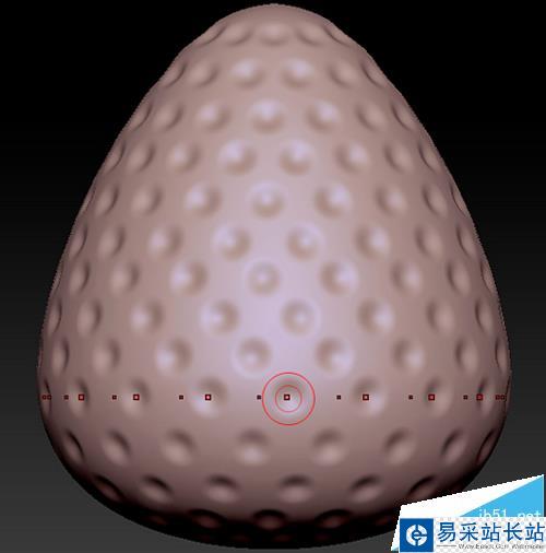 4、在筆刷菜單里,選擇Standard Brush,結合配置的Alpha 35和Drag Dot筆觸。接下來,在Zsub模式有效的情況下,開始雕刻草莓種子的空洞(如圖所示),將筆刷大小和Z強度調整到符合邏輯的大小,交替如圖所示的空洞,比較狹窄的部分,如頂端和底部,依次減少RadialCount值到16、14、12.