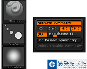 3、進入Transform菜單,點擊Activate Symmetry按鈕激活Symmetry(對稱),打開Z軸的Radial(R)模式(如圖所示),然后將RadialCount字段值設置為18。