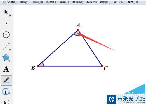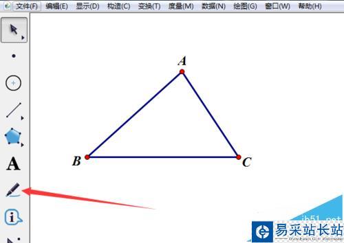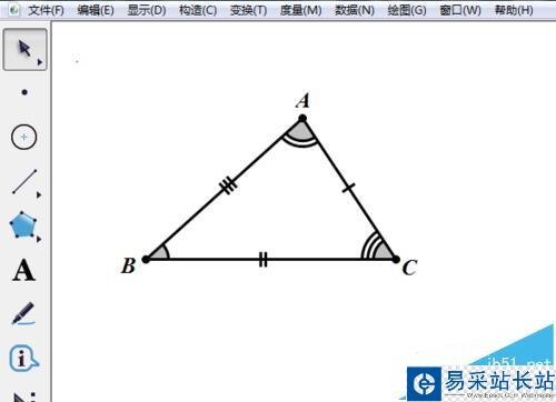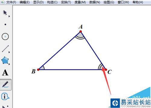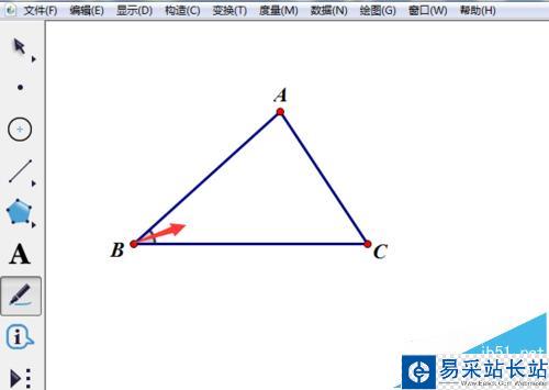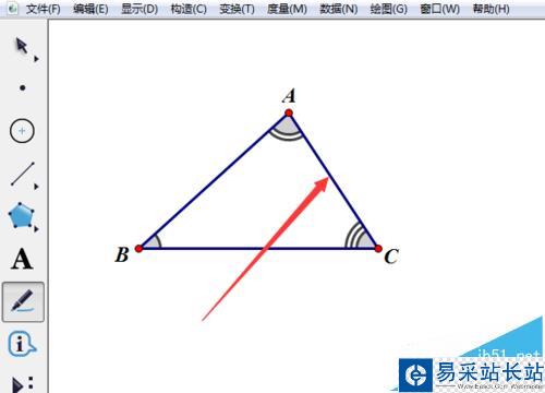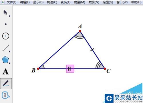 6、那么如何標記三角形的三邊呢?也是使用標記工具,在邊上單擊一下,就形成一條短線段。