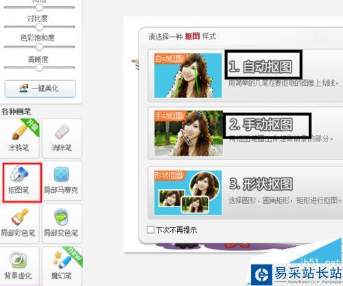 3、打開圖片之后,選擇其左側的“摳圖筆”,在彈出的小窗口中選擇“自動摳圖”或者“手動摳圖”,這個視情況而定。