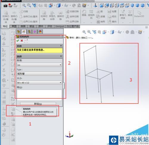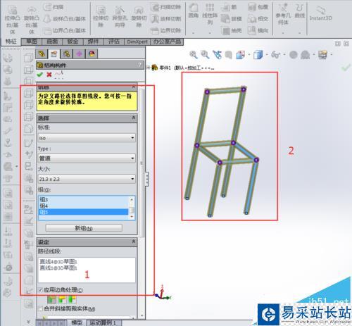 6、退出之后選擇結(jié)構(gòu)構(gòu)件,選擇需要的標(biāo)準(zhǔn)。(之后的經(jīng)驗會出自己定義設(shè)置結(jié)構(gòu)構(gòu)件)。選完之后直接點(diǎn)選3d草圖的線條就行。點(diǎn)選不了就換新組。(注意組與組的分離,以后的焊接清單中會用到,也能拆分成單個零件便于工程圖輸出)