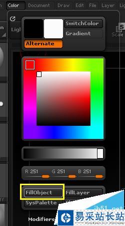 2、在ZBrush菜單欄中點開Color界面,在調(diào)色器中選擇純白色。然后點擊Fillobject按鈕填充顏色。