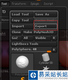 4、Tool>Export可以導出.OBJ文件,一般的三維軟件都支持該格式,模型的細分會保持導出時的級別。導入OBJ文件可以使用Tool/Import。