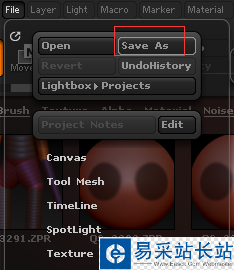 3、File>save as可以保存項目文件.ZPR,和ZTL格式相比,ZPR還保存材質和渲染設置、攝像機角度、動畫、貼圖、背景顏色等信息,文件的體積會稍大一點。打開ZPR文件額用File/Save。