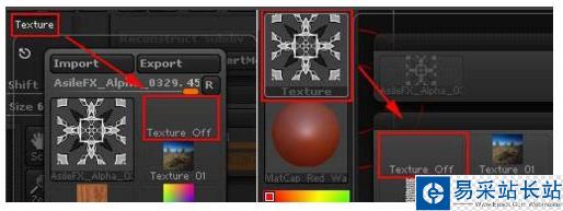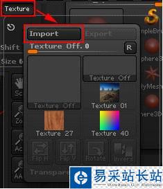 3、用按住Ctrl鍵拖動的方法建立遮罩,遮罩在球體上的分布不能達到我們的需要,因為遮罩不能精確的定位。而貼圖因為有UV分布的關系可以在模型上精確的分布,可以利用貼圖的精確定位的能力來決定遮罩的分布。Tool>Masking下的Mask By Intensity命令可以按照貼圖灰度的強度控制遮罩的分布。點擊Texture>Import或點擊如圖位置將素材圖片AsileFX_Alpha_0329導入,如圖所示。