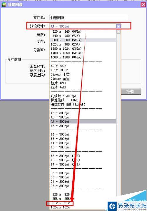 1、打開Easy Paint Tool SAI (線條繪制)V1.0.2d 綠色漢化版(以下簡稱SAI)。新建圖層,選擇預設尺寸,往下拉正方形尺寸,有四個格式任由選擇,這里小窩選擇了512*512
