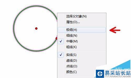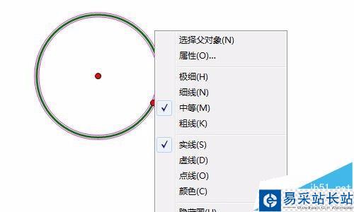 選擇移動工具,然后在圓周上點一下,這是圓就被選中了,選中的時候該圓成紅色顯示。然后點擊鼠標右鍵,選擇線型,比如極細,然后圓就變細了。要改變圓的顏色,點擊鼠標右鍵,選擇顏色比如黑色。