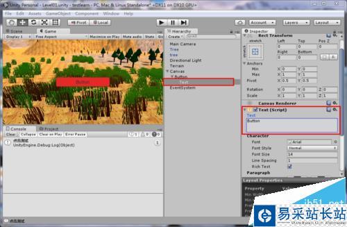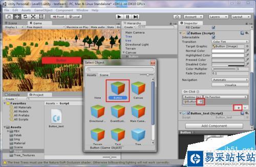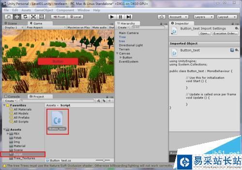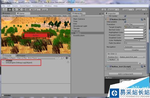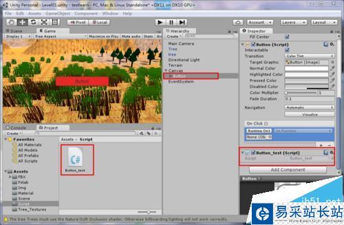 6、把編輯好的“Button_test”腳本添加到場景中的Button上。