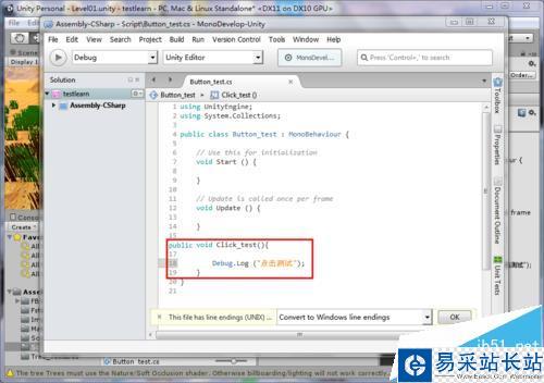 5、新建一個文件夾“Script”在里面新建一個“Button_test”的腳本,打開后在里面添加一個方法