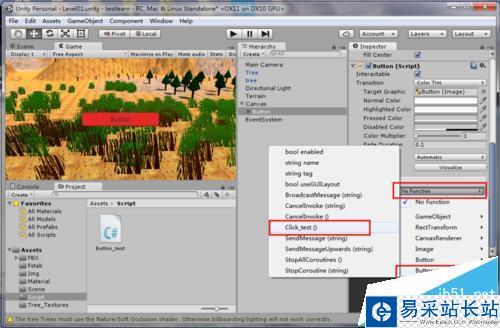 8、點擊“No Function”選擇“Button_test”--“Click_test ()”,保存后運行,點擊按鈕舊可以調用腳本中我們定義的Click_test ()方法,輸出“點擊測試”。