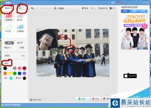 3、可以選擇畫筆樣式,直接在圖中添加;也可以選擇特定的形狀。把畫筆顏色改成紅色即可。