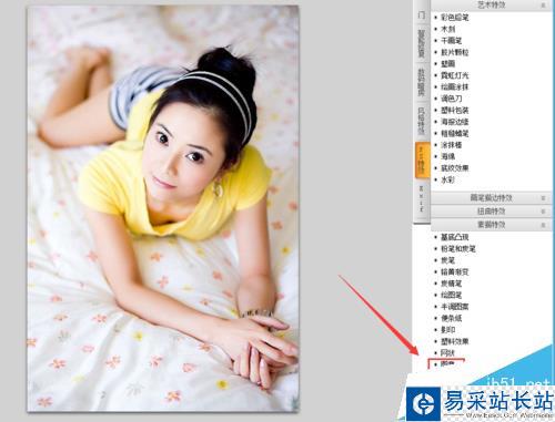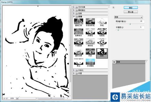 6、點(diǎn)擊PS效果選項(xiàng),在其選擇區(qū)域里找到素描選項(xiàng),在素描選的子級(jí)菜單里找到圖章命令,如圖所示: