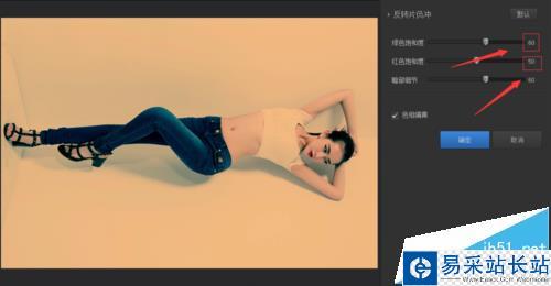 7、點(diǎn)擊反轉(zhuǎn)負(fù)沖選項(xiàng)后,我們圖片就自動(dòng)應(yīng)用該效果,在右側(cè)調(diào)節(jié)綠色飽和度和紅色飽和度的值分別為:60,50,如圖所示:
