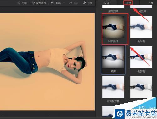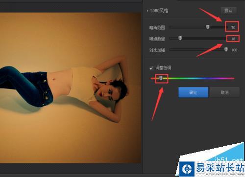 9、點(diǎn)擊LOMO選項(xiàng)后,我們的照片自動(dòng)應(yīng)用該效果,在右側(cè)調(diào)節(jié)暗角范圍為70,噪點(diǎn)數(shù)為16,顏色為淡黃色區(qū)域,如圖所示: