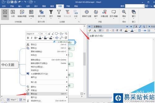 5、對(duì)主題添加備注:在許多情況下會(huì)需要對(duì)主題的介紹更復(fù)雜的內(nèi)容,文字說(shuō)明,單單在主題上說(shuō)明是不太方便的此時(shí)就需要用到備注功能,在該主題上右鍵選備注,就會(huì)出現(xiàn)備注框,如下圖:
