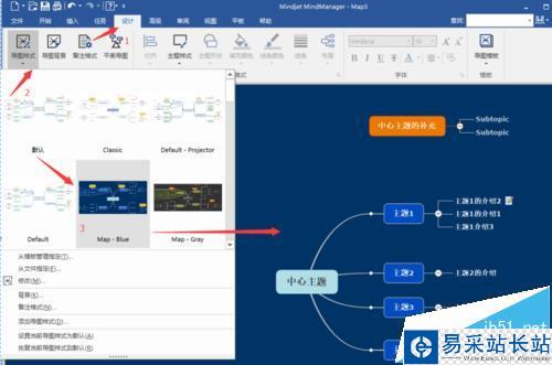 7、導(dǎo)圖樣式更改:可能有時(shí)候覺(jué)得我們導(dǎo)圖的樣式過(guò)于單調(diào),此時(shí)我們可以簡(jiǎn)單快速地利用系統(tǒng)給我們的樣式做下初步更改,在菜單欄中選擇設(shè)計(jì)中的導(dǎo)圖樣式,然后從中選擇一個(gè)你喜歡的樣式,如下圖: