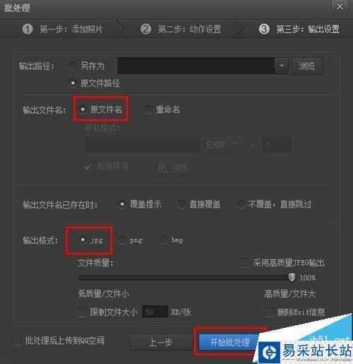 6、在輸入設置中,你可以選擇“原文件路徑”,在“輸出文件名”中選擇“原文件名”,可以減少一些必要的操作。在下面的輸出格式中選擇“jpg”(此前是png格式),然后點擊“開始批處理”。